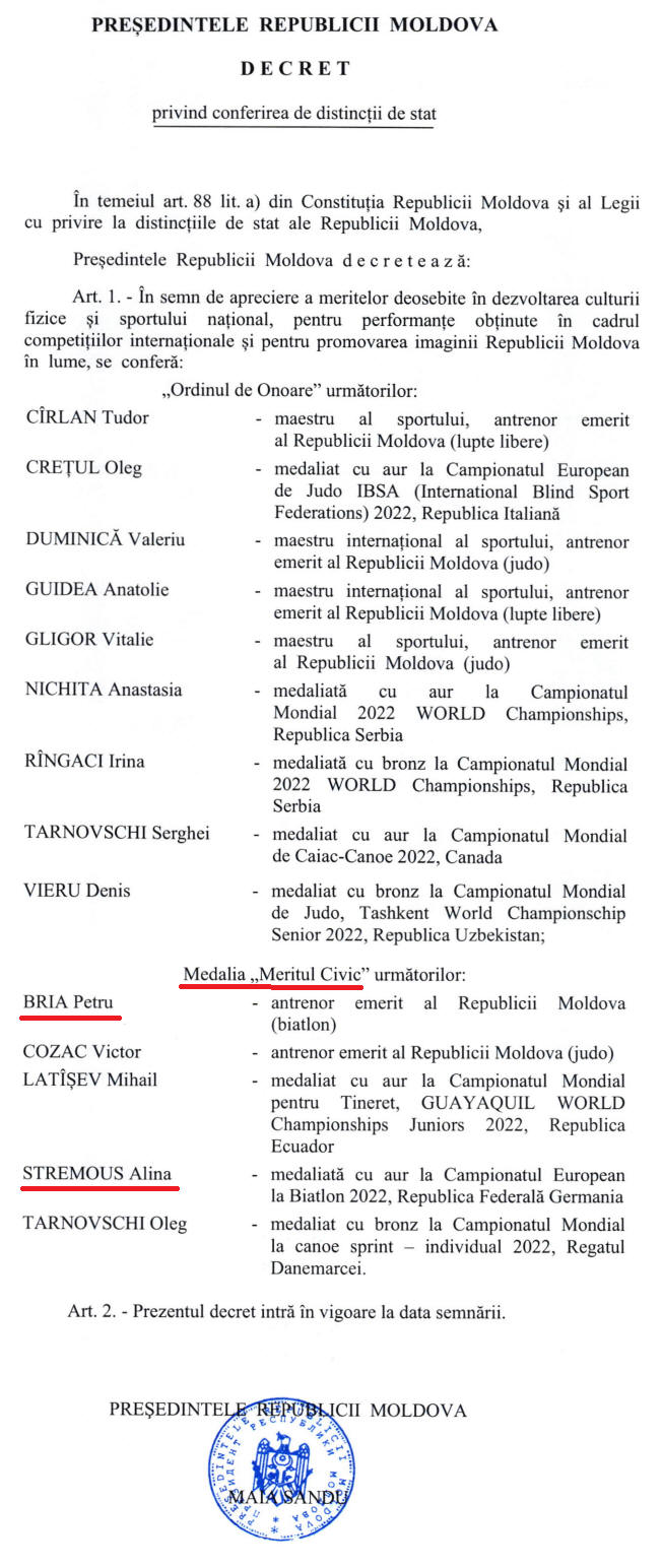 21 decembrie 2022 Decretul Președintelui Republicii Moldova dnei Maia Sandu privind conferirea de distincții de stat